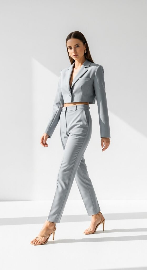 A cropped blazer with light gray trousers hits different. The shorter length elongates your legs while the structure adds polish to the soft trouser silhouette. In warmer months, pair with strappy sandals in nude or white for that barely there vibe.