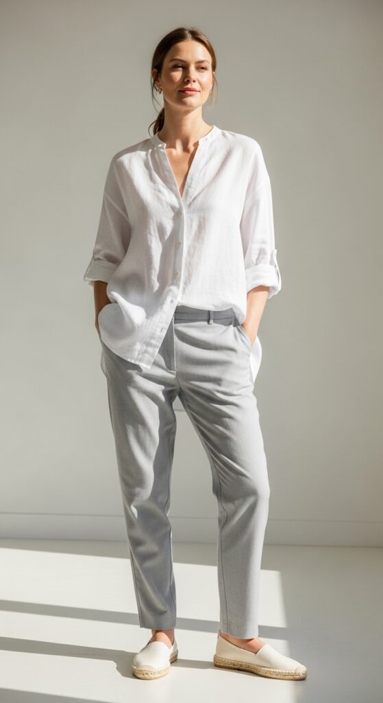 Nothing says effortless like linen. An oversized linen shirt in white or pale blue casually tucked into light gray trousers gives you that vacation state of mind, even if you’re just going to the grocery store. Add espadrilles, and suddenly you’re channeling Mediterranean chic.