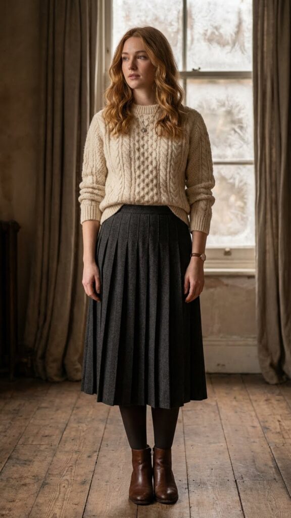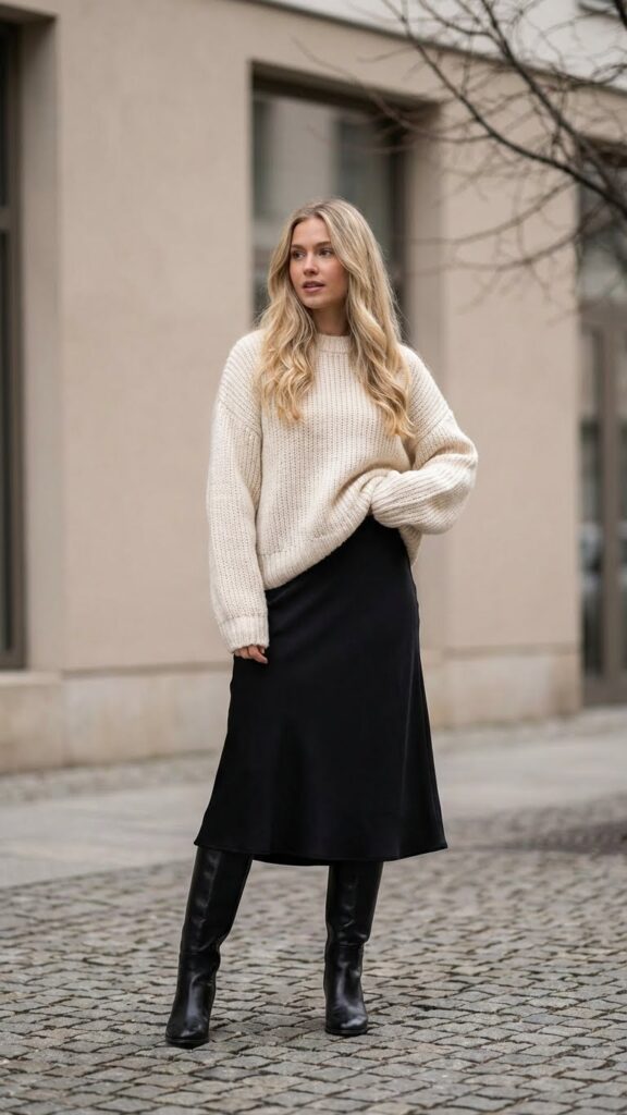 Start with a chunky knit sweater in cream, burgundy, or forest green. Tuck the front loosely into your waistband for definition. Add knee-high leather or suede boots to elongate your silhouette while keeping your legs warm.