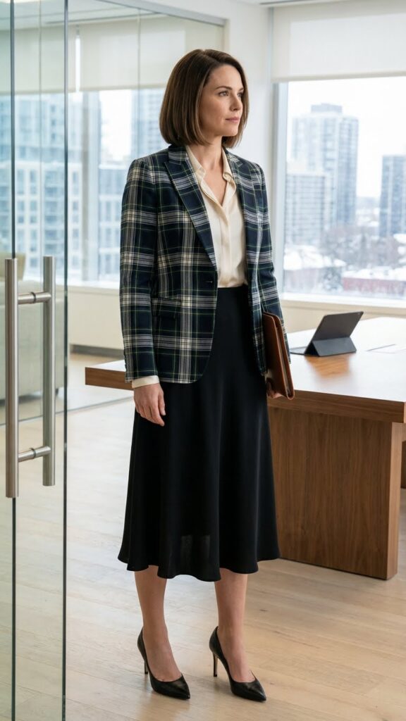 The contrast between bold plaid patterns and your sleek black skirt establishes visual interest without overwhelming your look. You’ll find this combination works perfectly for meetings, presentations, and everyday office wear.