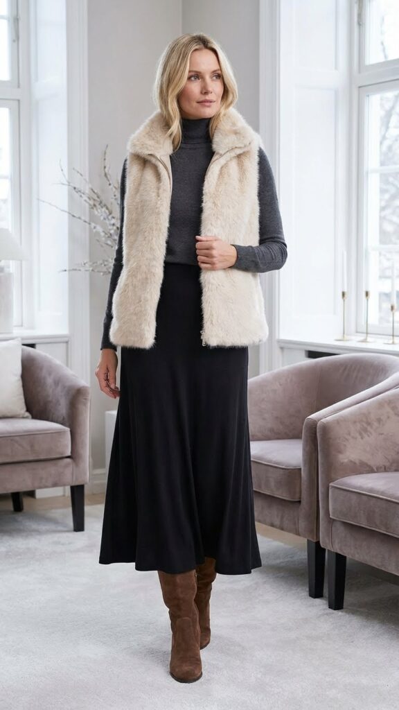 A faux fur vest layered over your long black skirt creates an effortlessly chic winter outfit that’s both warm and fashionable. You’ll love how the fur accents add instant glamour to your look without restricting your movement.