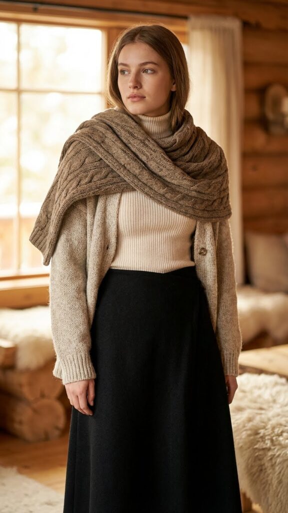 Build dimension by combining different fabric weights and patterns. Start with a ribbed turtleneck, add a wool cardigan, then finish with a blanket scarf draped freely around your shoulders. This approach lets you adjust layers throughout your day.
