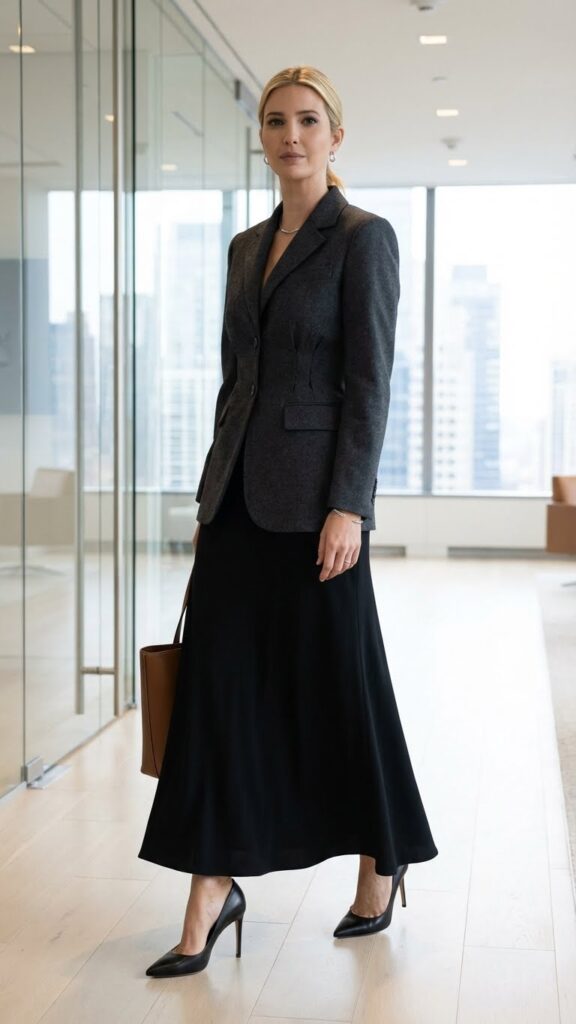 A customized blazer instantly alters your long black skirt into a commanding ensemble that mesmerizes attention in any room. Choose a structured blazer that nips at your waist to create a polished silhouette that rivals any tailored pants look.