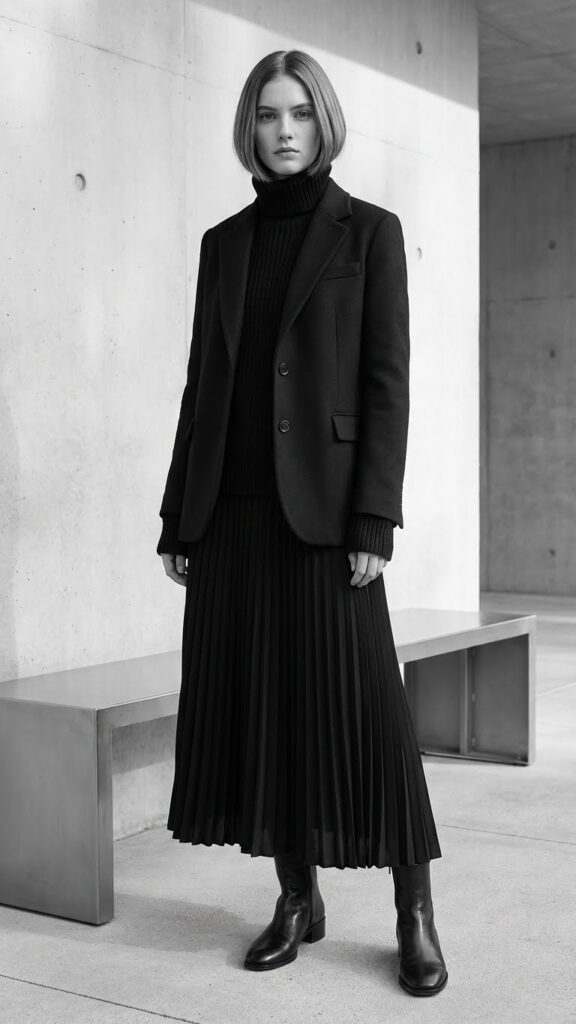 Start building your minimalist silhouette with a fitted black turtleneck as your base layer. Add a chunky knit cardigan or structured blazer for warmth and dimension. The key lies in mixing layered textures—pair smooth silk with ribbed knits or combine matte wool with glossy leather accents.