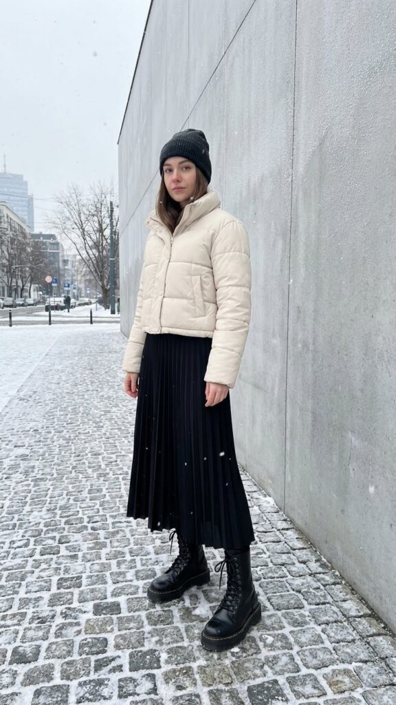 A cropped puffer jacket paired with combat boots alters your long black skirt into an edgy winter statement. This combination lets you break free from traditional winter styling while staying warm and comfortable. The cropped silhouette highlights your waist and creates visual balance with the flowing skirt length.