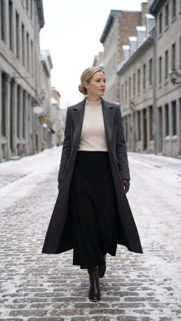 Complete your ensemble with pointed-toe ankle boots and a structured handbag. This combination gives you the freedom to move confidently through any winter occasion while looking effortlessly put together.