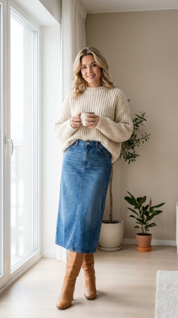 When temperatures drop, pairing a chunky knit sweater with knee-high boots creates the perfect cozy-chic combination for your long denim skirt. You’ll love how the contrasting textures between soft wool and structured denim add visual interest to your outfit.