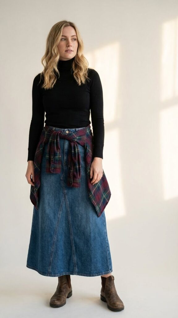 A plaid flannel shirt tied at the waist brings together classic style and practical warmth for your long denim skirt outfit. This look creates a defined silhouette while adding vintage appeal to your winter wardrobe. You’ll love how the knot draws attention to your waistline and breaks up the length of your skirt.