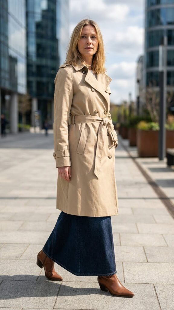 Choose a mid-length or long trench that hits at or below your skirt’s hemline for balanced proportions. Belt it at the waist to define your shape and add structure to the relaxed denim fabric. Opt for sleek finishing touches like pointed-toe boots and a structured handbag to complete the look.