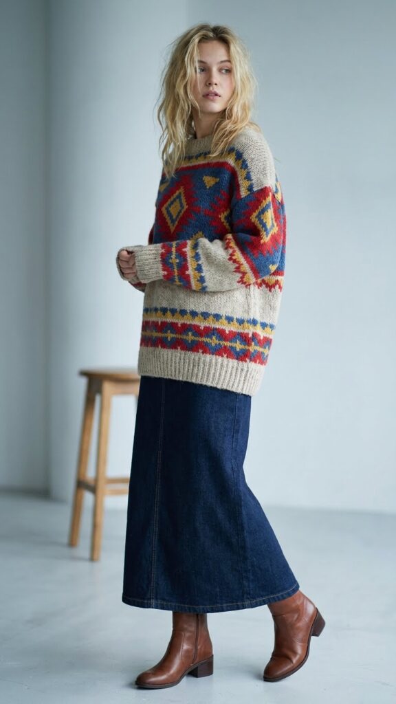 Don’t shy away from bold pattern mixing this season. You can pair geometric sweaters with your classic denim, or try Fair Isle prints for a cozy vibe. The key is keeping your skirt simple while your knitwear does the talking.