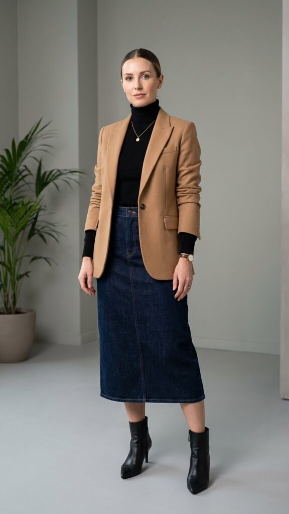 Although casual denim skirts dominate weekend wardrobes, a customized blazer and turtleneck combination instantly enhances your long denim skirt for professional settings. This pairing creates a structured silhouette that flatters your figure while keeping you warm during cold months.