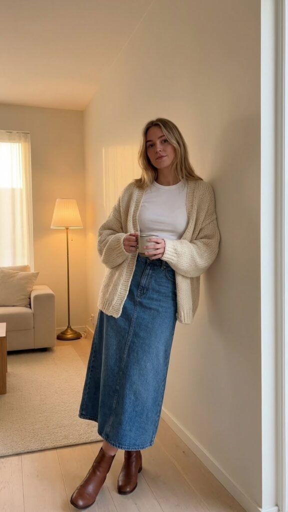 A cozy cardigan layered over a basic tee creates one of the most versatile and comfortable winter outfits you can pair with your long denim skirt. This combination gives you the freedom to move through your day without sacrificing style or warmth. Knit skirt winter outfit ideas can provide inspiration for creating a cozy and textured look.