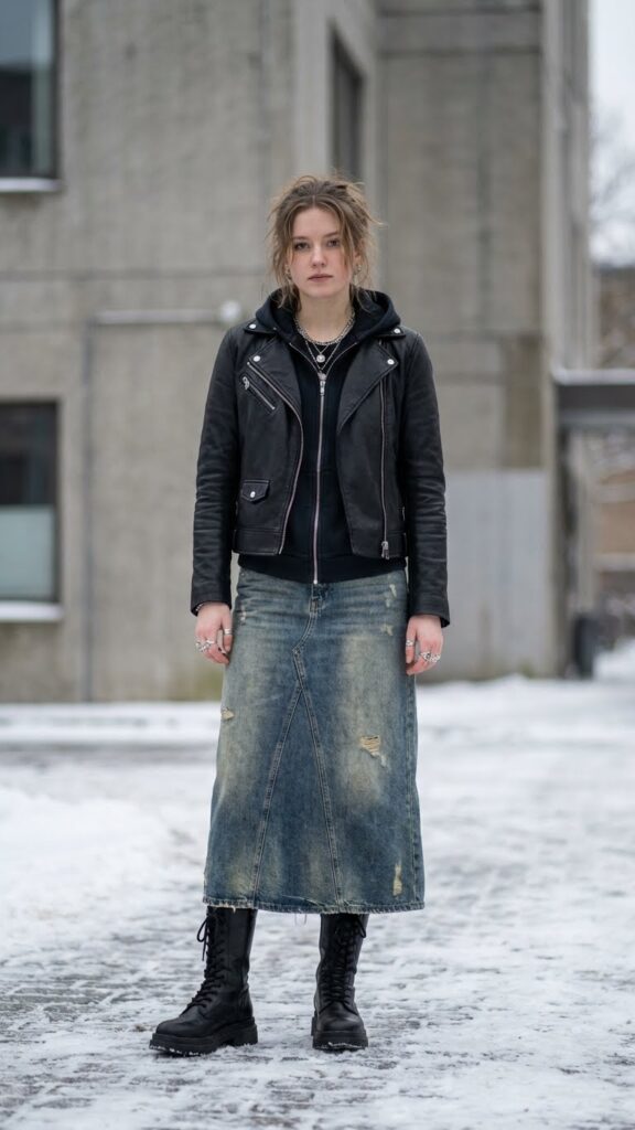 When you want to add some edge to your long denim skirt, a leather jacket paired with combat boots delivers instant attitude and warmth. This combination works perfectly with distressed denim, creating a rebellious vibe that lets your personality shine through.