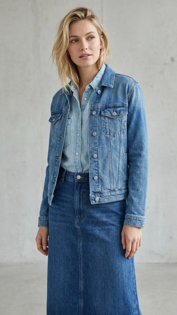 Start by pairing your long denim skirt with layered denim pieces like a chambray shirt under a darker wash jacket. This technique prevents the outfit from looking too uniform while keeping you warm.