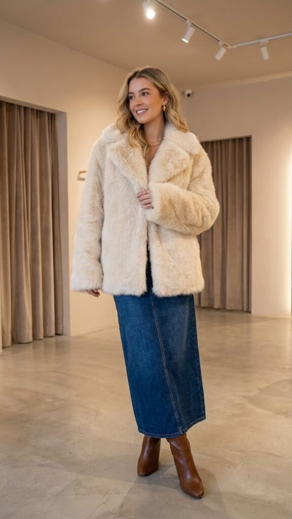 Draping a luxurious faux fur coat over your long denim skirt instantly enhances your winter look from casual to runway-ready. This combination lets you express your bold, independent style while staying warm during colder months.
