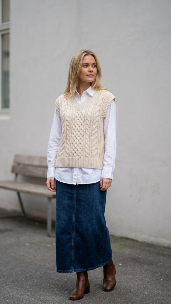 A classic cable knit vest layered over a crisp button-down shirt creates the perfect preppy-meets-casual vibe with your long denim skirt. This timeless combination gives you polished style without feeling restrictive or stuffy.