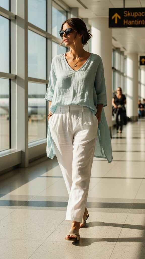 This outfit works beautifully for Mediterranean travel, beach destinations, or anywhere you want to immediately feel vacation-ready. The natural fibers let your skin breathe, and the relaxed fit means you’re never uncomfortable. It’s basically summer travel perfection.