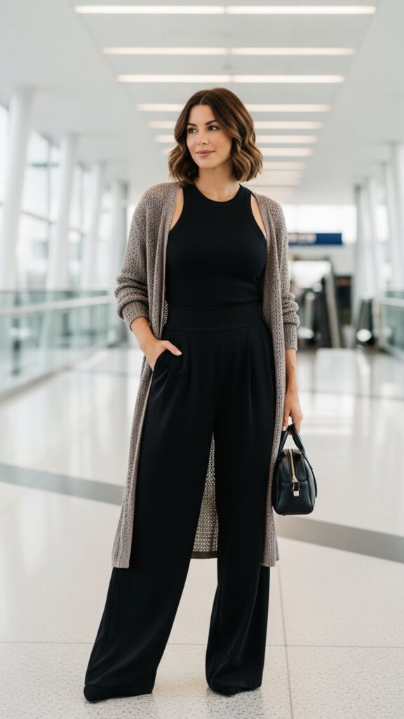 Style tip? Choose pants in black, navy, or charcoal so they hide inevitable travel stains. Because let’s face it, turbulence and tomato juice are not friends. This look gives you that “I’m a sophisticated traveler” energy while keeping everything loose and comfy where it counts.