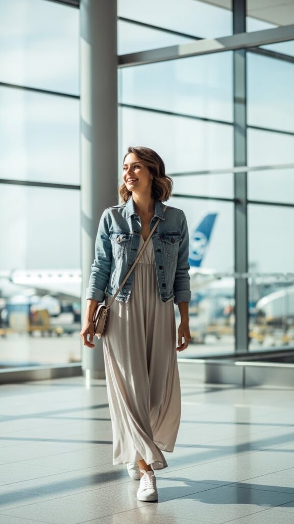Pair it with white sneakers to keep things casual and a cropped denim jacket for layering. The jacket gives you arm coverage for chilly planes and adds structure so the whole look doesn’t read as “I literally just rolled out of bed.” Bonus points if you choose a dress with pockets because where else are you supposed to put your phone, passport, and emergency chocolate?