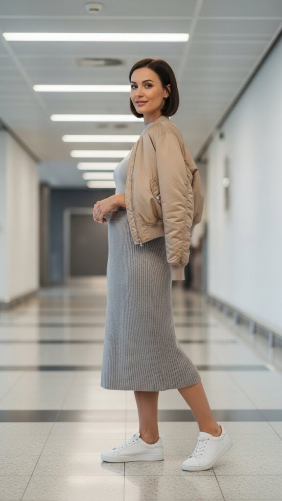 The sneakers are crucial here because they keep the look casual and comfortable while balancing out the femininity of the skirt. Add a bomber jacket or hoodie for layering, and you’ve created an outfit that’s different from the standard travel uniform but just as comfy. The midi length is perfect because it’s not too short (hello, plane seats) but not so long that you’re tripping over it.
