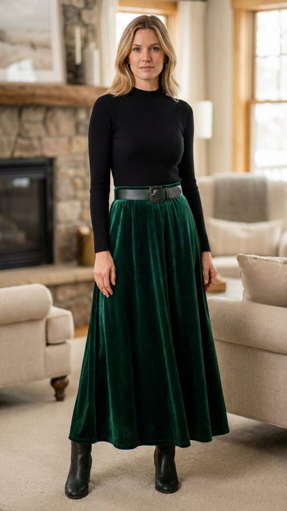 When you pair a fitted mock neck top with a velvet maxi skirt, you’re creating one of winter’s most sophisticated casual combinations. The form fitting silhouette of the mock neck highlights your frame while the flowing velvet adds graceful movement below.