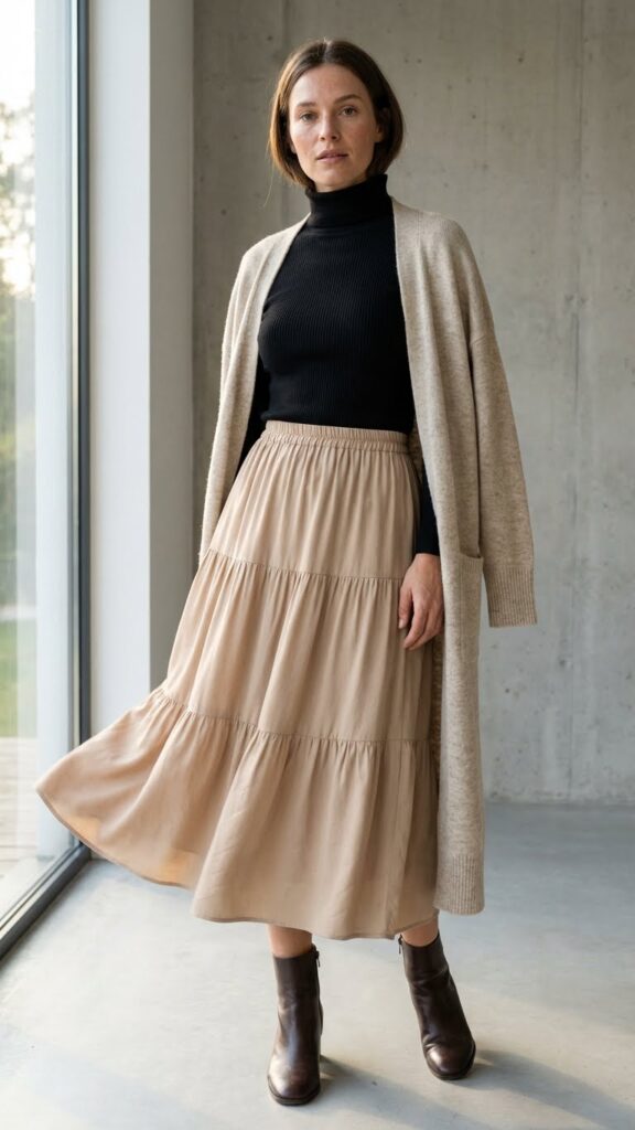 Turtlenecks tucked into flowy tiered skirts create one of winter’s most flattering silhouettes. This combination defines your waist while allowing movement and freedom below. You’ll love how the structured top balances the romantic, cascading tiers. Blending style and comfort is the key to these winter midi skirt outfits.