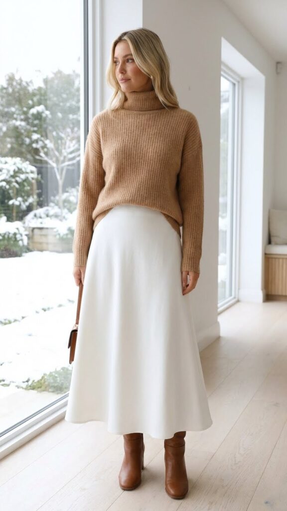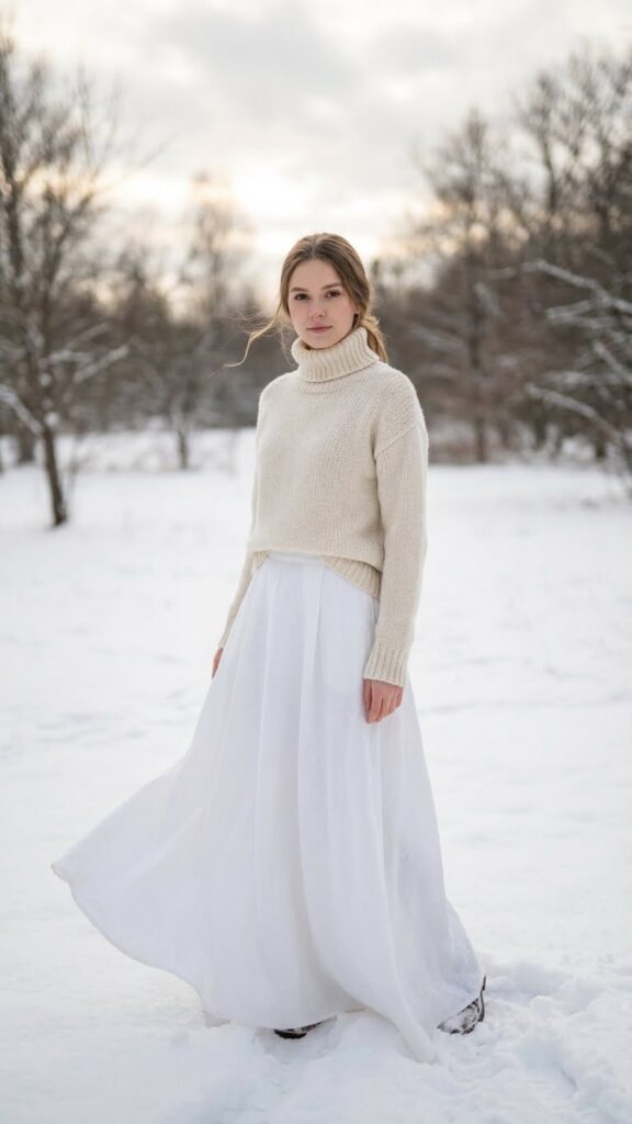 For versatility, consider how this base outfit adapts to different occasions. Swap the turtleneck for a long white skirt with a denim jacket on milder days. When spring arrives, shift to a long white skirt with a floral blouse for a fresh look. Stylish winter looks with a white skirt can easily transition throughout the seasons. Complete your winter ensemble with ankle boots and layered gold necklaces for effortless sophistication.