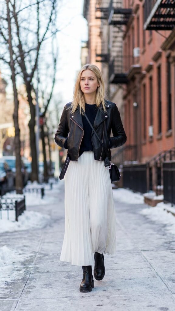When you want to add edge to your feminine white skirt, nothing works better than a classic leather jacket and ankle boots. This combination creates the perfect balance between soft and bold, giving you an effortlessly cool vibe.