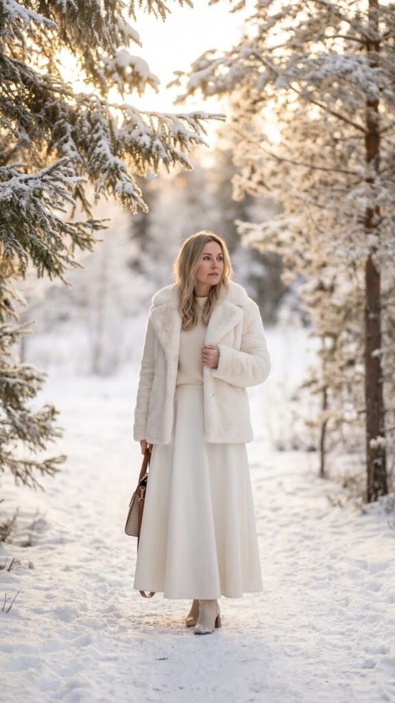 For an even more glamorous take on winter styling, swap your leather jacket for a luxurious faux fur coat. This combination creates a graceful silhouette that’s perfect for holiday parties or upscale winter events. You’ll love how the soft texture contrasts beautifully against your flowing white skirt. Long skirt winter outfit ideas can provide additional inspiration for elegant winter looks.