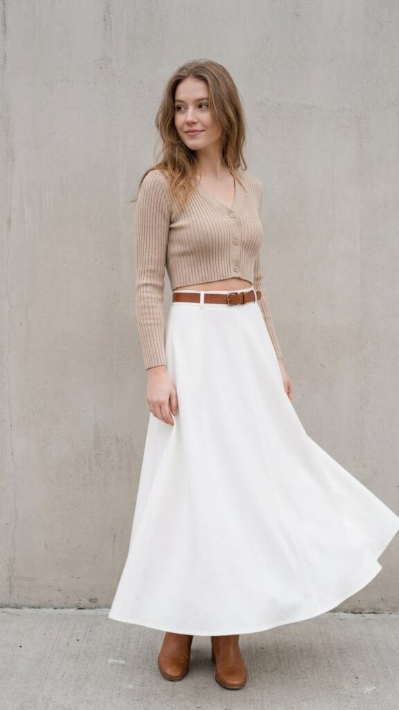 Cropped cardigans create the perfect balance of cozy and chic when styled with a long white skirt and belt. This combination lets you express your personal style while staying comfortable throughout the day.