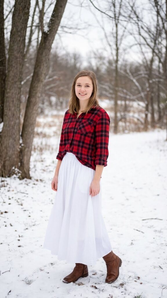 Have you ever considered how a plaid flannel shirt can alter your long white skirt into the perfect casual-chic ensemble? This combination gives you effortless style while maintaining complete comfort and freedom of movement.