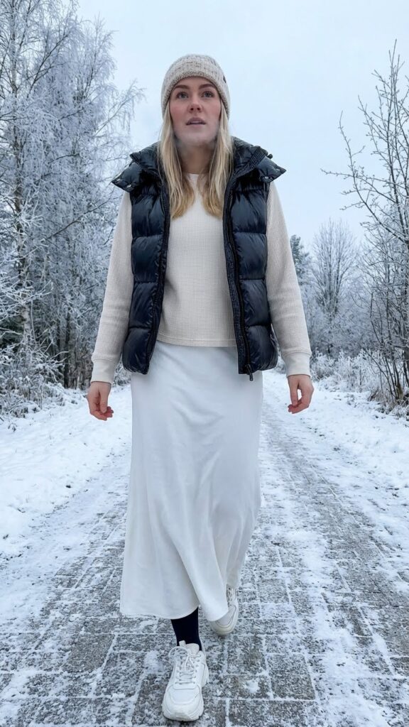 Long White Skirt With a Puffer Vest and Thermal Top