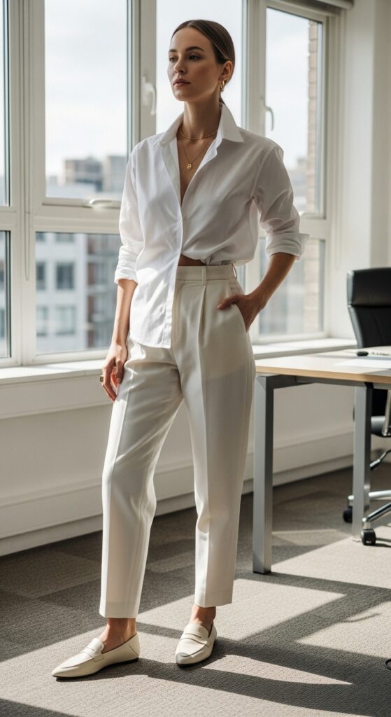 This is giving “I have my life together” energy without actually requiring you to have your life together. A crisp white button-down tucked into high-waisted loose trousers is the outfit equivalent of a perfectly made bed. It just works.