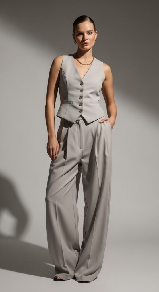 This outfit has that editorial, “I’m someone who reads fashion magazines” quality without requiring much effort. Neutral vests play it safe, but pinstripes or subtle patterns add personality.