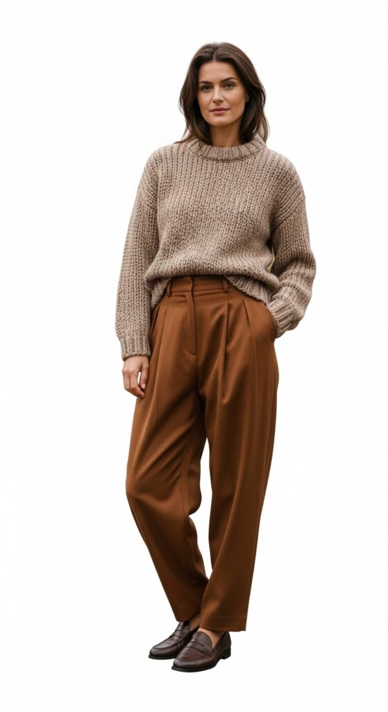 A chunky knit sweater with pleated loose trousers is the cozy fall outfit you’ll want to wear constantly.