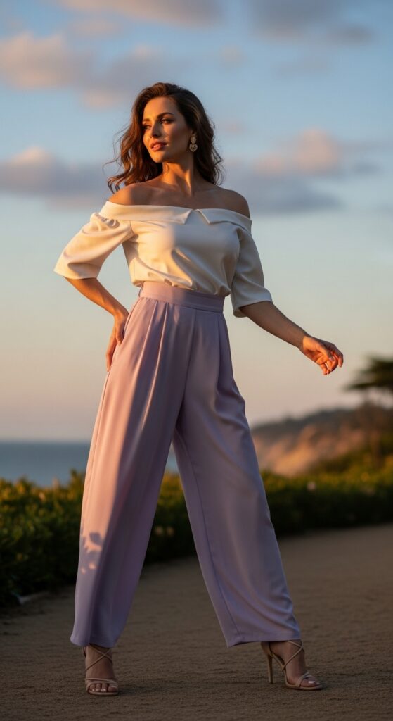 For warmer days or special occasions, an off-the-shoulder top with loose, flowy trousers is romantic and easy.