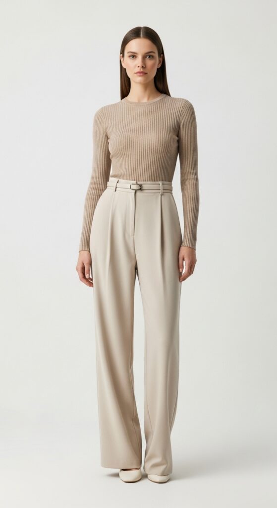 A fitted ribbed tank top with high-waisted tailored loose trousers is minimalism at its finest. This outfit relies on fit and fabric rather than extra pieces, which makes it incredibly easy to throw together.