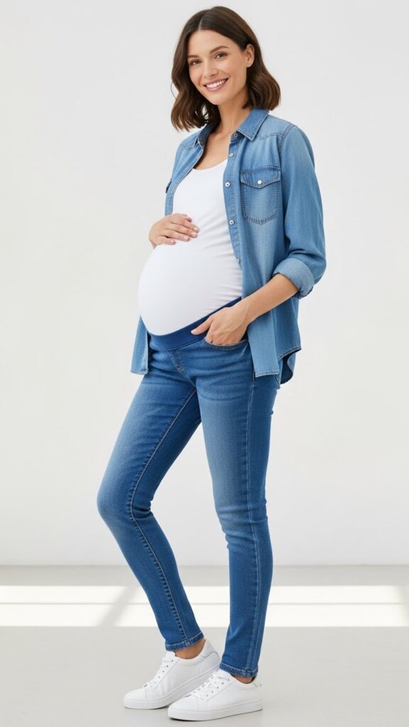 Pair stretchy maternity jeans in a medium wash with a lighter wash denim shirt or jacket. Make sure one piece is significantly lighter or darker than the other so you get that intentional contrast.