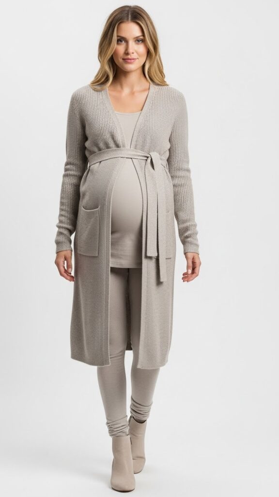 Choose a knee-length or longer cardigan in a neutral color and belt it just above your bump with a soft leather or fabric belt. Underneath, wear leggings or maternity jeans and a simple fitted top.