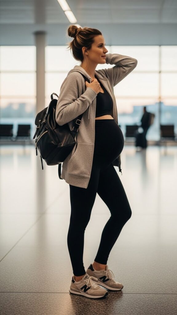 Pair with white sneakers or flat sandals and a crossbody bag. Add a denim or leather jacket for layering and you’ve got an outfit that transitions seamlessly from travel day to actually doing things at your destination. This look proves you can still experiment with style during pregnancy without sacrificing comfort or practicality.
