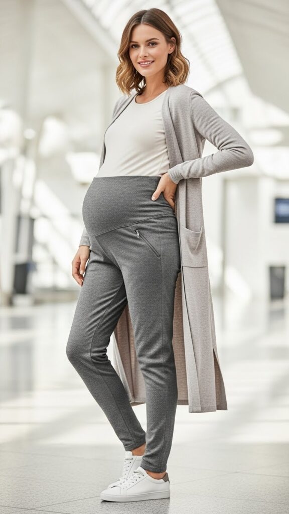 Look for tapered joggers in a ponte or thick knit fabric rather than sweatpant material. Maternity versions with a supportive panel are your best friend here. Pair them with a fitted long-sleeve tee or ribbed bodysuit to balance the relaxed bottoms.