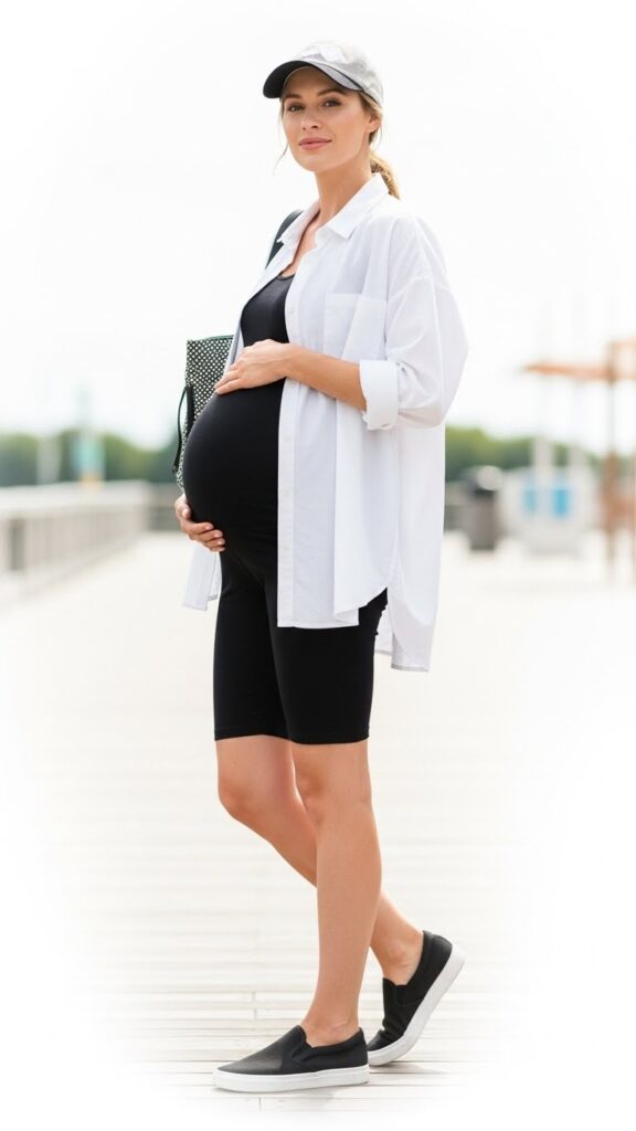 Choose high-waisted maternity bike shorts in black and style them with an oversized linen or cotton button-down shirt. You can wear it open over a tank or buttoned with the sleeves rolled up.