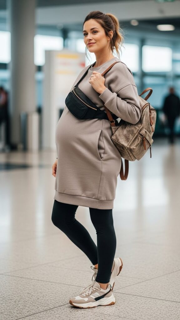 A sweatshirt dress is basically permission to be cozy while still looking intentional. It’s the perfect middle ground between “I’m trying” and “I’m comfortable,” which is exactly where you want to be when traveling pregnant.