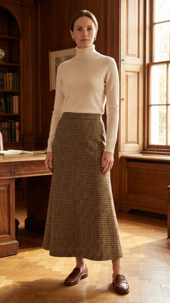 Pair your tweed maxi with a soft cashmere sweater to achieve perfect textural balance between formal and comfortable elements. Cashmere combinations work beautifully because they soften tweed’s structured appearance while adding luxurious warmth. Complete this sophisticated ensemble with leather loafers for comfortable all-day wear that moves seamlessly from morning meetings to afternoon presentations, giving you the professional polish you need.