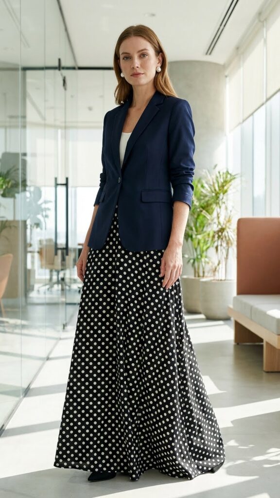 A polka dot maxi skirt brings playful sophistication to your office wardrobe while maintaining the professional polish you need for workplace success. Balance the pattern with a solid blazer in navy, charcoal, or cream to create visual harmony.