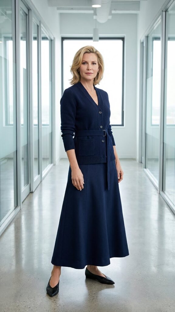 Navy A-Line Maxi Paired With Structured Cardigan and Pointed Flats