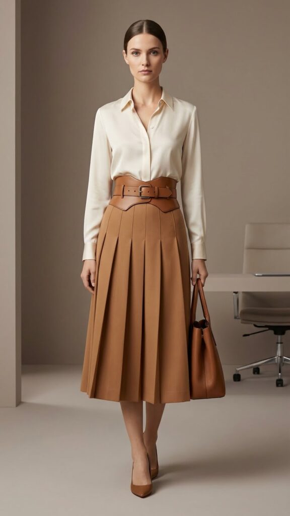 Add leather accessories to complete this polished look. A structured leather belt defines your waistline while maintaining professionalism. Choose cognac or black leather pumps and a matching handbag for cohesion. This combination offers versatile migration from boardroom meetings to after-work events, giving you the freedom to move confidently through your day.