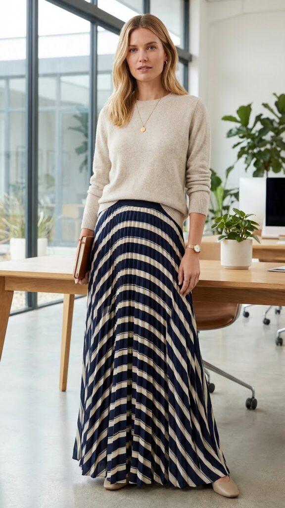 Pleated midi-length maxis bring sophisticated texture and movement to your professional wardrobe while offering more coverage than standard midi skirts. You’ll create a graceful silhouette by tucking a crisp button-down or silk blouse into the waistband, ensuring clean lines throughout your outfit.