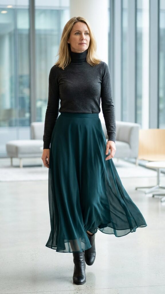 You’ll achieve balanced proportions by pairing your chiffon maxi with a fitted turtleneck that defines your waistline and upper body. Choose neutral colors like navy, charcoal, or cream for maximum versatility. Ankle boots add structure and prevent the outfit from appearing too casual. This combination lets you move freely throughout your workday while projecting confidence and style. The polished appearance ensures you stay comfortable during those inevitable long workdays without sacrificing professional elegance.