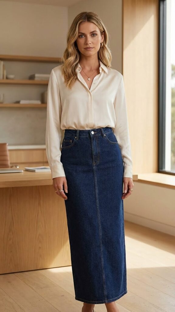 Although denim might seem too casual for professional settings, a well-styled denim maxi skirt can become a refined office staple when paired with the right pieces. Choose an ideal midi length that hits mid-calf for maximal professionalism while maintaining comfort throughout your workday.